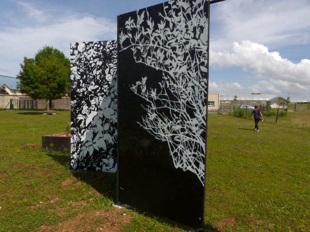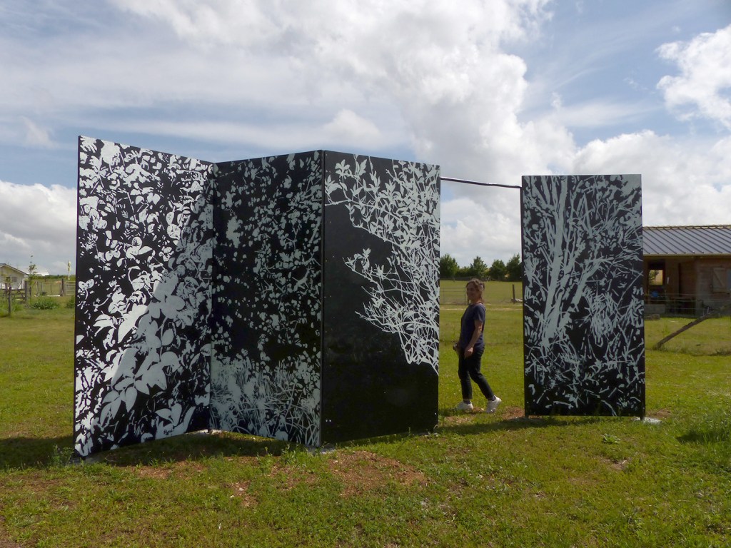 L’installation La Maison des vents, constituée de 4 panneaux de bois peints, est installée dans le parcours Art et Nature du domaine de La Chataigneraie (Sésame Autisme).