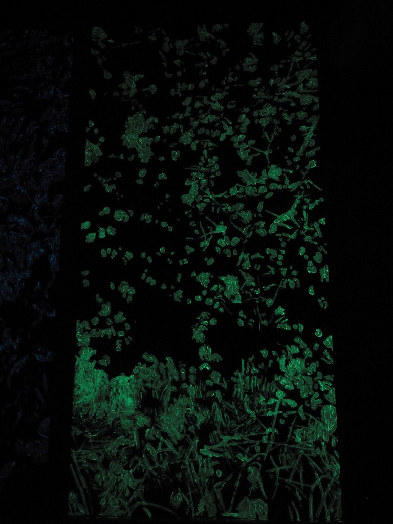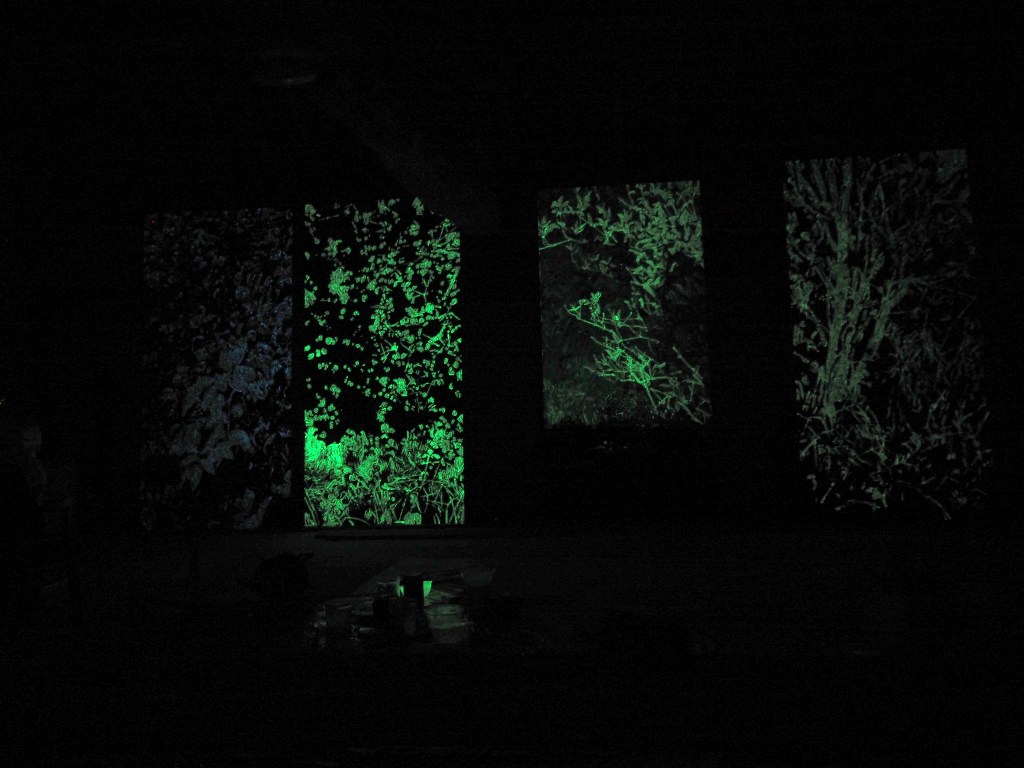 Acrylique et pigments phosphorescents sur bois. 4 panneaux + structure de métal. 250 x 488 cm. Installation.