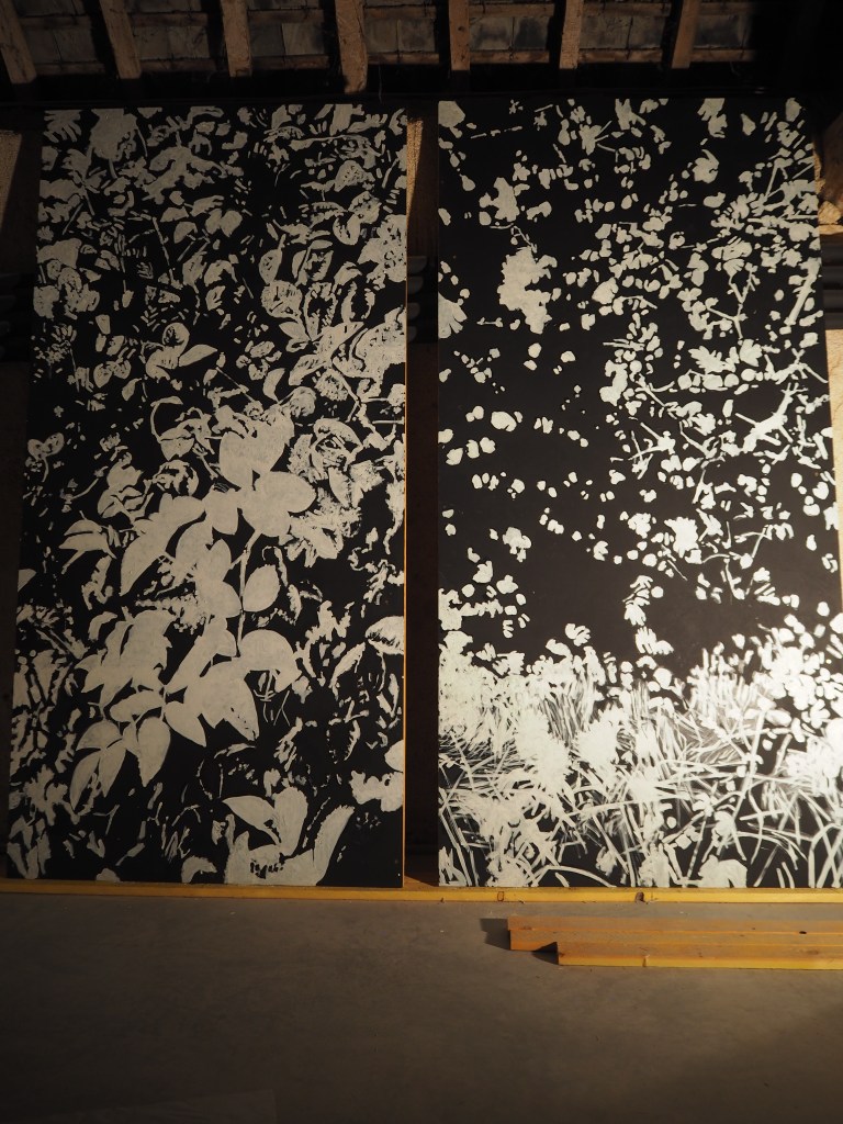 Par la disposition des panneaux, le jeu de l’espace entre eux et autour, La maison des vents est à mi-chemin entre le paravent, l’objet de contemplation, et l’observatoire. Cette installation est visible de jour et de nuit grâce à l’utilisation d’une peinture phospho-luminescente qui brille la nuit et révèle les motifs végétaux directement inspirés par les arbres et buissons du parc.