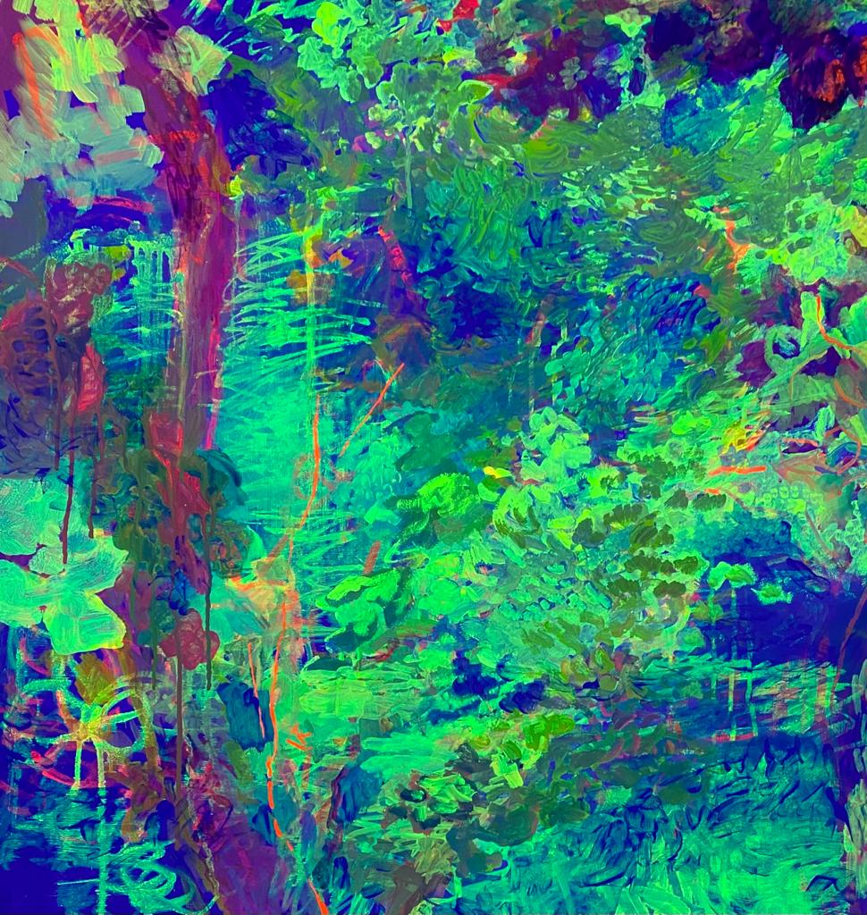 Les miroirs d’Aphrodite sont autant visibles de jour que de nuit. Plongées dans l’obscurité, elles se métamorphosent : car lorsqu’elles sont éclairées avec une lumière Ultraviolet on découvre un travail invisible à la lumière du jour. On voit alors les pigments fluorescents enfouis sous les couches de peinture dessiner dans la nuit un nouveau paysage.